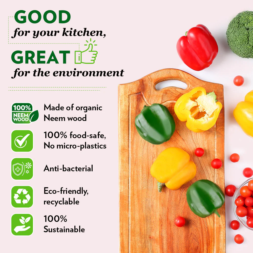 We took the advice of our grandmothers and present to you our Dice Pro chopping board, made of a single block of neem wood. Its natural anti-bacterial properties ensure that the chopping board is never home to any harmful bacteria. It will also not break into half, splinter or dull the sharpness of your favourite knives. Bonus: it looks really good too!