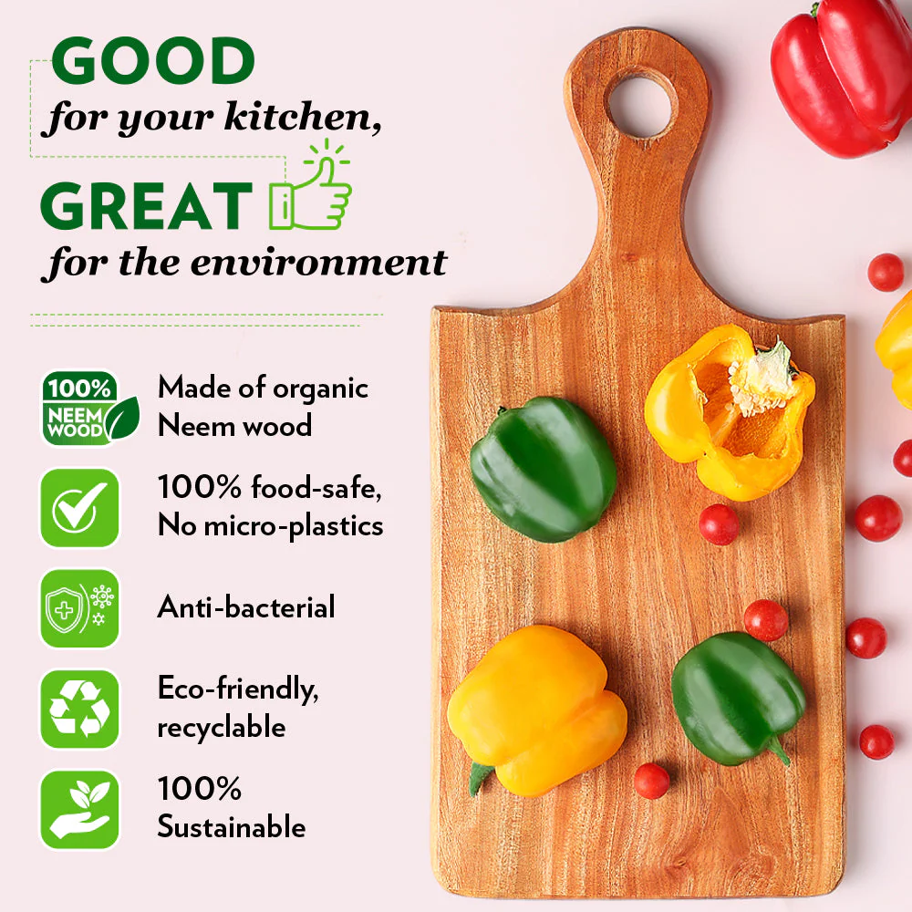 We took the advice of our grandmothers and present to you our Dice chopping board, made of a single block of neem wood. Its natural anti-bacterial properties ensure that the chopping board is never home to any harmful bacteria. It will also not break into half, splinter or dull the sharpness of your favourite knives. Bonus: it looks really good too!